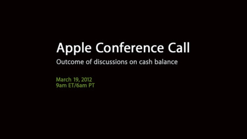 Apple has announced that it will hold a conference call tomorrow at 9:00 a.m. EDT to discuss plans for the company's $100 billion in cash reserves. The discussion will be led by CEO Tim Cook and CFO Peter Oppenheimer.