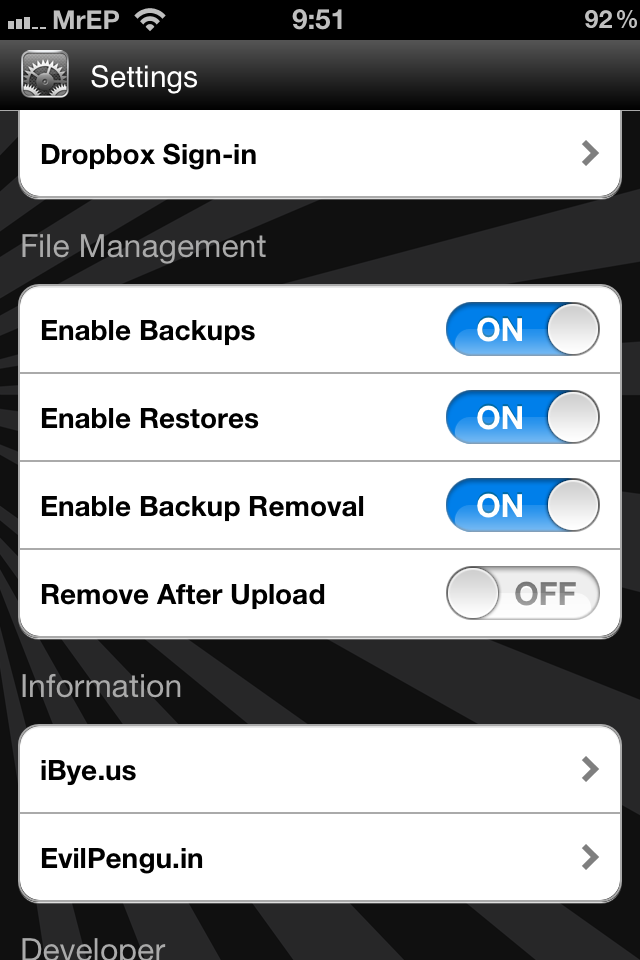 Have you ever wanted to make a backup of your data, but iTunes wasn't around or iCloud was down? Then iBye is the application for all your data needs. iBye will backup your data to an FTP server of your choice, and restore it as well. iBye also supports Dropbox and local; more coming soon.