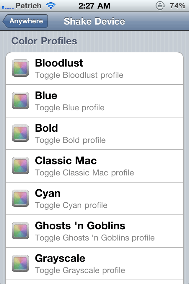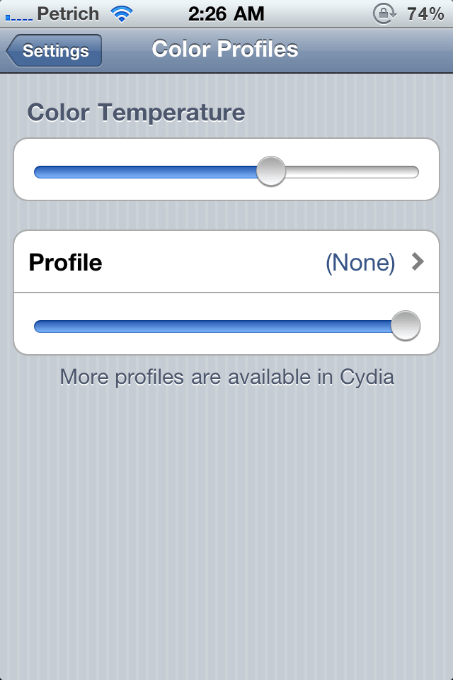 Custom color profiles for iPhone, iPad and iPod touch. Adjustable color temperature. Many bundled custom color profiles. More profiles coming soon in Cydia. Quick toggle via Activator.