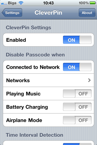 CleverPin allows you to make your iPhone ask for passcode intelligently: you can choose to automatically disable it while you're connected to your home network (more than one network supported, add the network you're connected to with only 1 tap), listening music or charging battery, or even during specified periods of time.