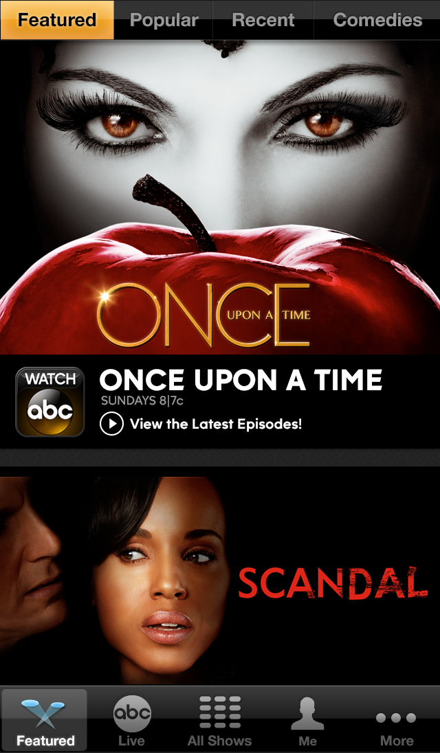 Features: - View ABC shows ON DEMAND such as Scandal, Once Upon a Time, Modern Family, Grey's Anatomy, Good Morning America, General Hospital, Jimmy Kimmel Live! and more. - Available on iPhone, iPad, iPod touch. - Didn't finish your episode? Pick up where you left off. - Closed captioning available on select shows/episodes.