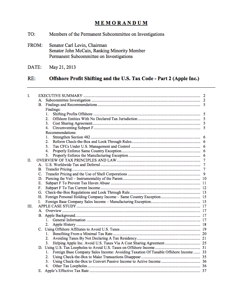 "Apple wasn’t satisfied with shifting its profits to a low-tax offshore tax haven," said Sen. Levin. "Apple sought the Holy Grail of tax avoidance. It has created offshore entities holding tens of billions of dollars, while claiming to be tax resident nowhere. We intend to highlight that gimmick and other Apple offshore tax avoidance tactics so that American working families who pay their share of taxes understand how offshore tax loopholes raise their tax burden, add to the federal deficit and ought to be closed."
