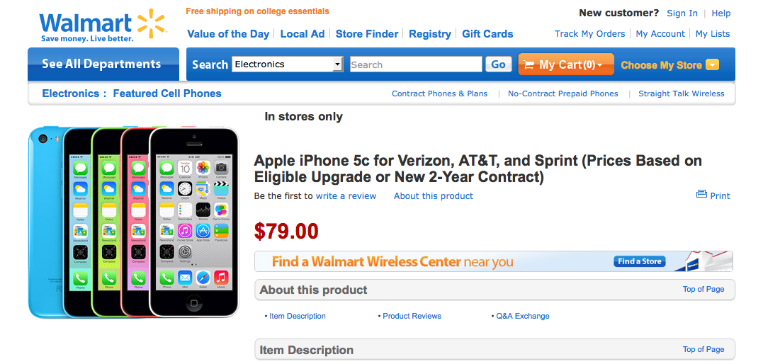 The Apple iPhone 5c will be sold at Walmart for $79 · 16GB; available in all five colors (blue, white, pink, yellow and green) · Customers can pre-order the iPhone 5c for free starting Friday, Sept. 13 by visiting the customer service desk at their local store. · Starting at 8 a.m. on Friday, Sept, 20, customers can pick up their phone at the wireless connection center OR wait just one day and trade-in their current smartphone on Saturday, Sept. 21. The trade-in value will be applied to the purchase of a new iPhone 5c with a two-year contract. · Pre-order customers must pick up their iPhone 5c by Sept. 25. · The fulfillment of pre-orders will be processed on a first come, first serve basis, which is subject to manufacturer availability and carrier launch dates.