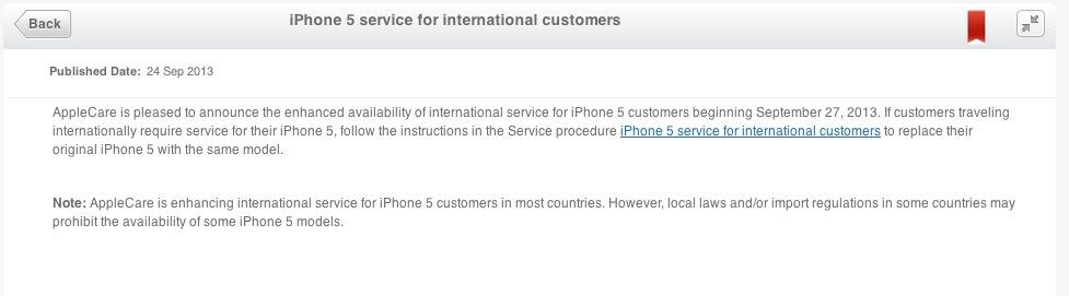 AppleCare is pleased to announce the enhanced availability of international service for iPhone 5 customers beginning September 27, 2013. If customers traveling internationally require service for their iPhone 5, follow the instructions in the Service procedure iPhone 5 service for internal customers to replace their original iPhone 5 with the same model.