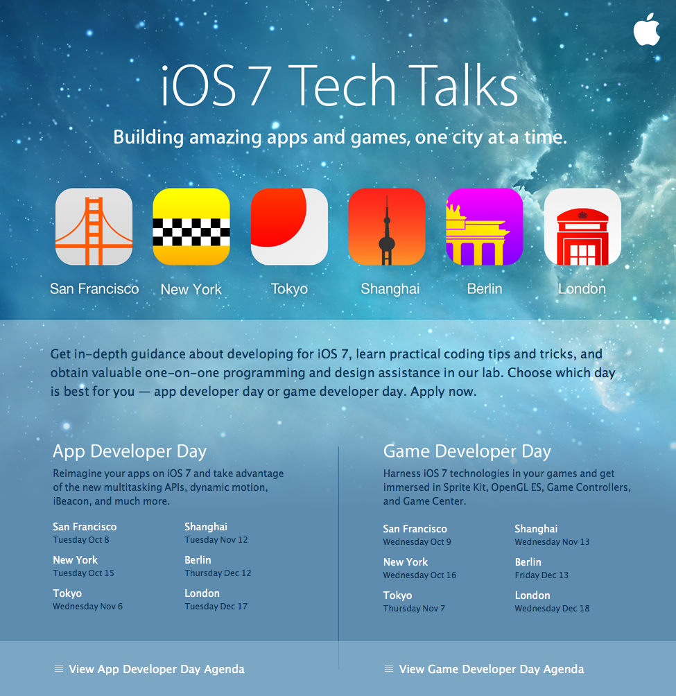 Apple has just announced iOS 7 Tech Talks in San Francisco, New York, Toyko, Shanghai, Berlin, and London.