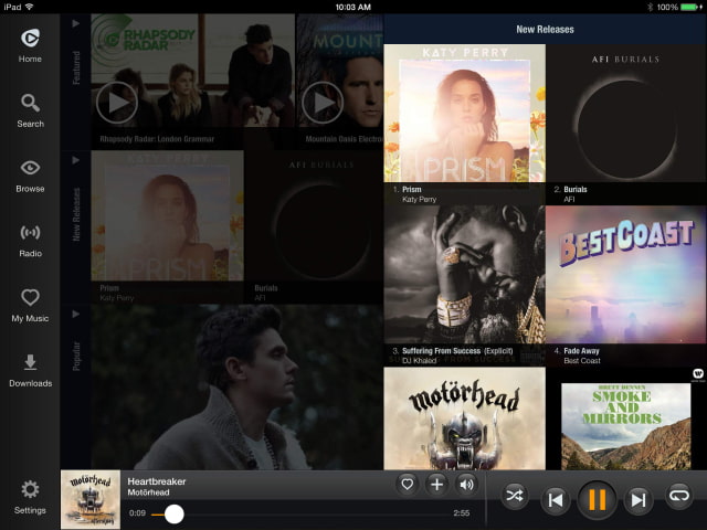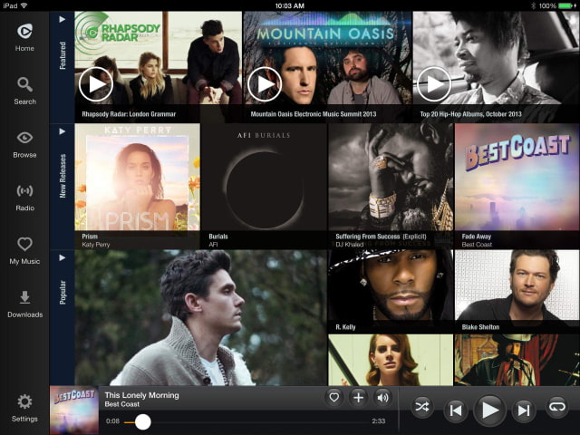 The Rhapsody music app has been updated bringing significant improvements including a swipe to reveal menu and the ability to play and shuffle tracks by artist.