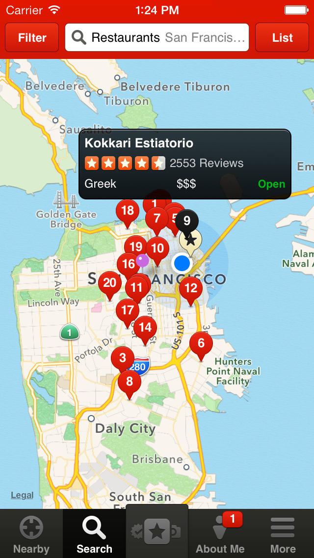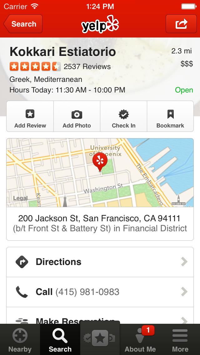 FEATURES: • Search for businesses near you • Tap quick links to find nearby bars, restaurants, cafes and more • Narrow your searches by 'hood, distance, price, and what's open now • Browse reviews to read what's great (and not so great) in your city • Find great Deals offered by your favorite local businesses on iPhone • Add tips, photos, and draft reviews for your favorite businesses • Check-in and share on Facebook and Twitter • Make reservations on OpenTable without leaving the Yelp app • Look up addresses and phone numbers for thousands of businesses, then call or map them from your iPhone or iPad • Yelp does augmented reality with Monocle. Overlay business information onto the world around you.