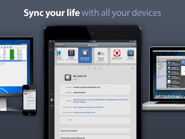 Features: - Generate strong, unique passwords for every site - Protect your data behind a single Master Password - Secure with military grade 256-bit AES encryption - Cryptographic operations use standard iOS libraries to ensure no security gaps or backdoors - Auto-Lock keeps your data protected even if your device is lost or stolen - Create, edit and use many item types including: Credit Cards, Secure Notes, Passports, Bank Accounts, and much more
