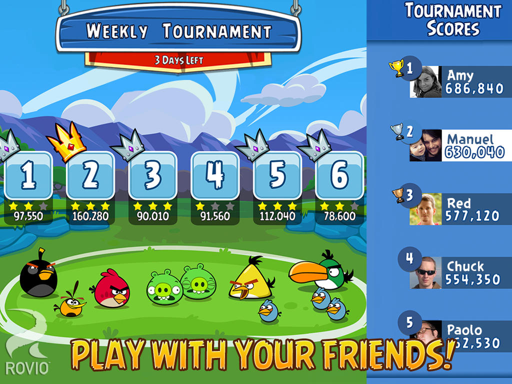 In this FREE new game, you can use your phone to challenge your Facebook friends for the title of ultimate pig popper and bird flinger! Play in weekly tournaments with your friends and see if you can snag the coveted bronze, silver and gold trophies. Plus, gather daily rewards, send and receive gifts, and brag about your accomplishments! And if you’re playing Angry Birds Friends on Facebook, your tournament progress will automatically be updated, so you can continue playing wherever you are!