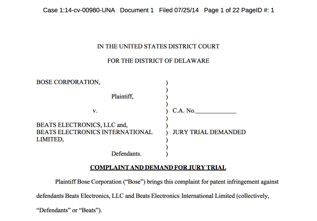 Bose has sued Beats, a company which Apple has agreed to acquire, over its noise-cancelling headphone patents. The company has also filed a complaint in the U.S. International Trade Commission against Beats, and others, asserting infringement of the same patents.