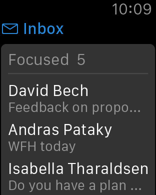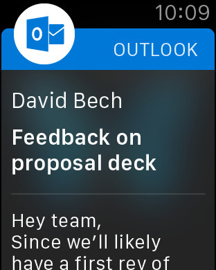 Here are the 3 top things you’ll now be able to do straight from your wrist: ● Get a quick glance of what’s happening in your Outlook Inbox or what’s next in your calendar just by swiping up from the Watch face. Just try it, you’ll love it. ● Need more context? Catch up with unread emails during your busy day right from the Outlook Watch App. When it’s really urgent, just reply directly from your watch with the set of replies we’ve pre-written just for you. We also have emojis and voice dictation if you're more than kind of person. ● Never miss what’s really important to you. Get notified of important emails and take action immediately thanks to our custom notifications. Archive that. Schedule this for later. It’s easy as 1, 2, 3.