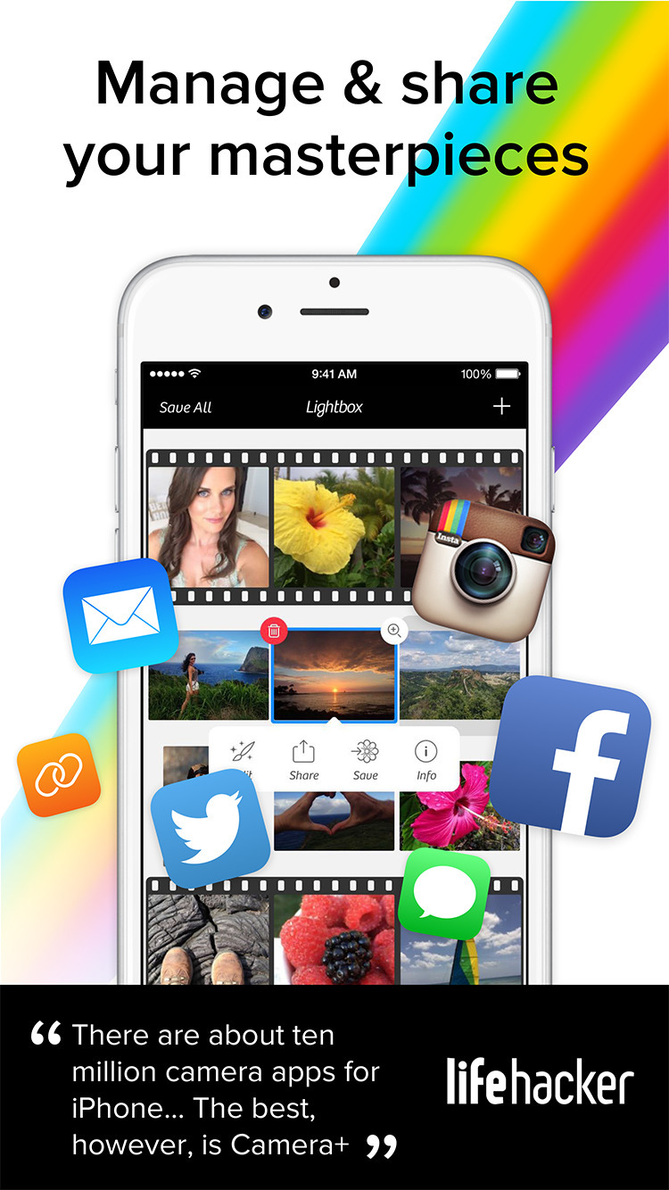 All the pics you take in Camera+ go in the innovative Lightbox where you can quickly and easily skim through them and get rid of bad shots. You save only the photos you’re satisfied with so that your camera roll stays neat and clean.