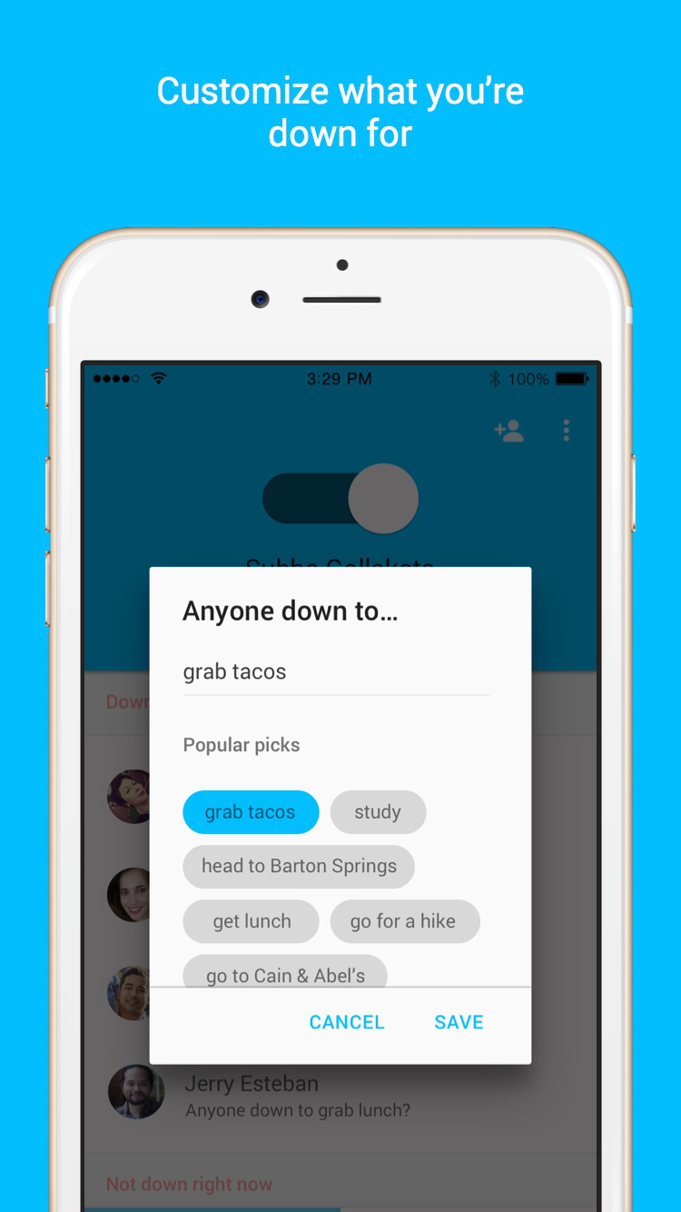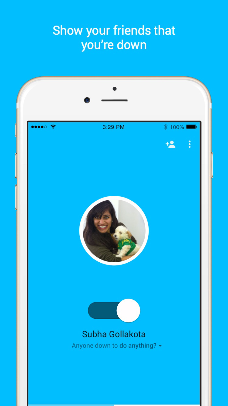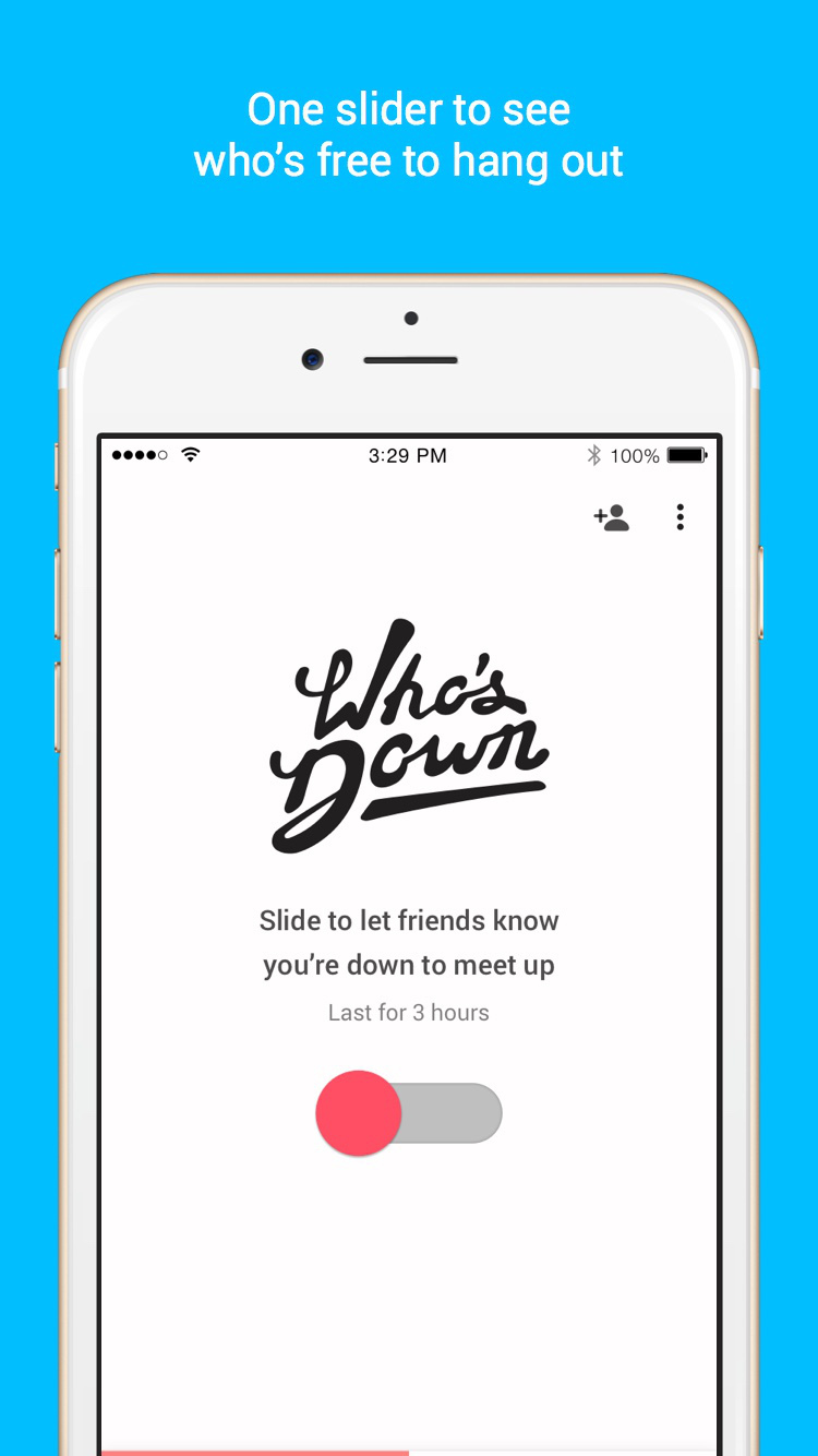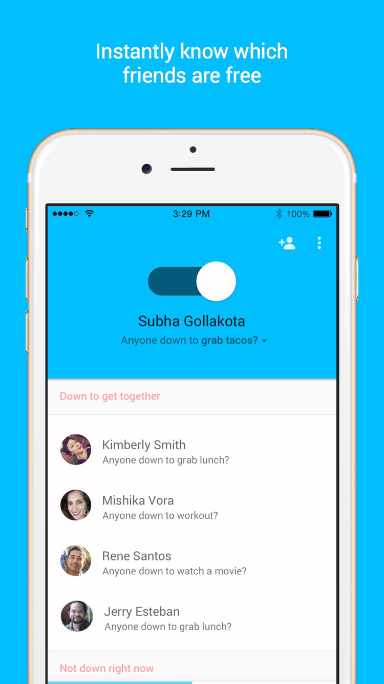 Instantly see which of your friends are free to hang out, right when you are. And with one slider, you can let your friends know you’re down to hang out too. It’s that simple. Who’s Down: always know who is free to hang out, so you never miss out on the fun.