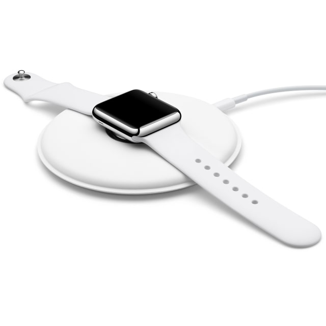 With the Apple Watch Magnetic Charging Dock, you can charge your Apple Watch in a flat position with its band open, or on its side. When docked on its side, your watch automatically goes into Nightstand mode, so you can also use it as your alarm clock. The Apple Watch Magnetic Charging Dock uses the same inductive charging connector that comes with Apple Watch. It charges both the 38mm and 42mm models. And it connects via the Lightning to USB Cable and Apple 5W USB Power Adapter.