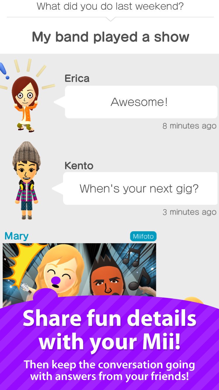 Then your Mii will ask your friends for fun details about them...and tell YOU everything. Your friends' Mii characters will also visit you when you play! Miitomo is a new way to bring you and your friends together like never before. Would you expect anything less from Nintendo?