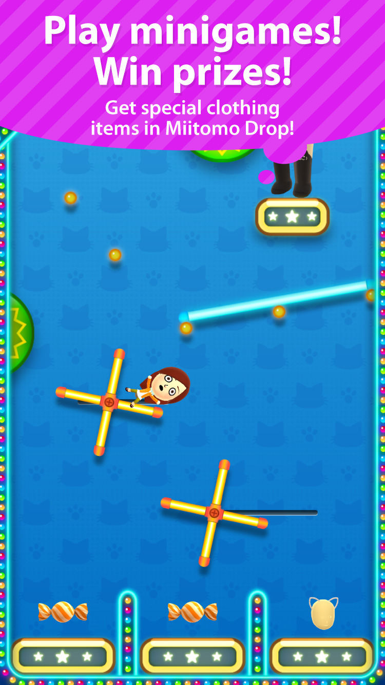 ■ Win Prizes From Miitomo Drop Miitomo features a minigame in which you drop a Mii into a play field, and then watch it bounce around as it falls toward a variety of platforms. You'll win a prize based on where it lands. Some clothing items are available only in Miitomo Drop. Note: To play Miitomo Drop, you need Miitomo coins, which you earn by playing Miitomo or by using game tickets, which you can get as a daily bonus, among other ways. You can also purchase Miitomo coins.