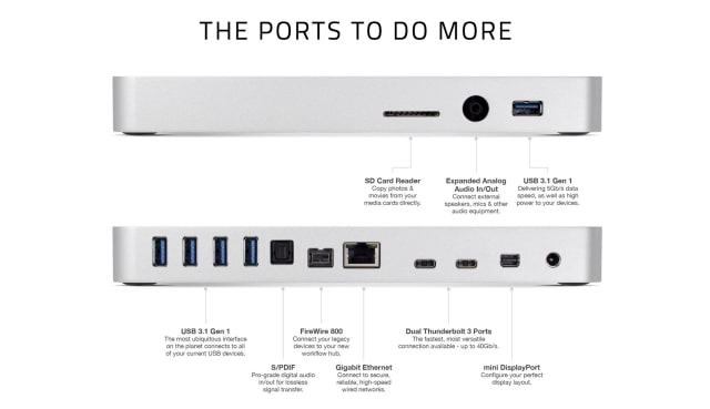 Extreme Connectivity with 13 Ports ● (2) Thunderbolt 3 ○ Two USB-C ports ○ Daisy chain and power up to 5 Thunderbolt 3 devices ● (5) USB 3.1 Gen 1 ○ Including two high-power USB Type-A ports for fast mobile device charging ● FireWire 800 ● Gigabit Ethernet ● mini DisplayPort ● SD Card reader ○ Easily transfer photos and video from an SD card ● Audio combo port ○ For headphones or microphones ● S/PDIF digital audio