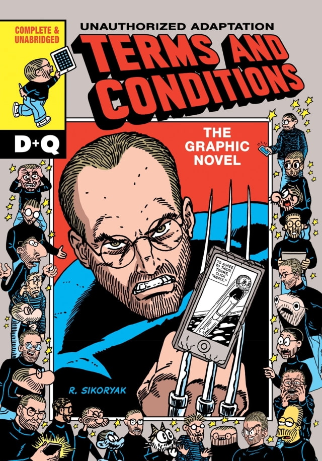 For his newest project, R. Sikoryak tackles the monstrously and infamously dense legal document, iTunes Terms and Conditions, the contract everyone agrees to but no one reads. In a word for word 94-page adaptation, Sikoryak hilariously turns the agreement on its head―each page features an avatar of Apple cofounder and legendary visionary Steve Jobs juxtaposed with a different classic strip such as Mort Walker’s Beatle Bailey, or a contemporary graphic novel such as Craig Thompson’s Blankets or Marjane Satrapi’s Persepolis.