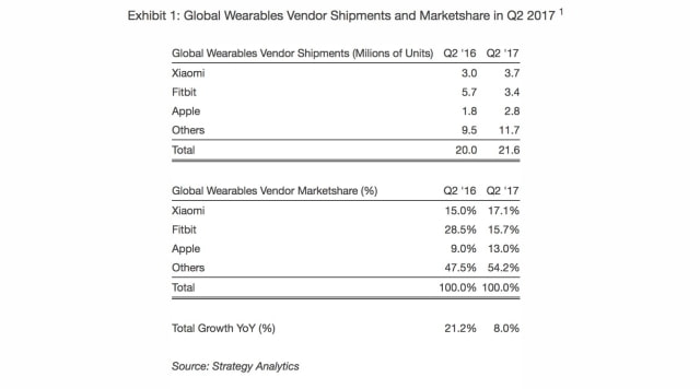 Global wearables shipments reached 22 million units in Q2 2017 with Xiaomi capturing 17% marketshare, overtaking Apple and Fitbit.