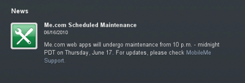 A news posting MobileMe website indicates that MobileMe will be offline for scheduled Maintenance on Thursday June 17th from 10pm to midnight (PDT)