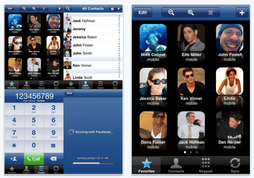 Feature Highlights: * Sync contacts pictures and information with Facebook (birthday, current address, website, company and job title) * Most advanced Facebook sync engine with conflict resolving algorithms offering best match gestures * Visual contact list - Full iPhone contact list with thumbnail photos * One touch favorites photo dialer with multiple page and zoom in/out capability * Birthdays list - view all contacts birthdays in one convenient place * Send Facebook messages directly from the contact list * Access friends Facebook profiles directly from the contact list * Shake To Search - Quickly search contacts by shaking the iPhone * Stylish designed keypad * iOS 4.0 ready.