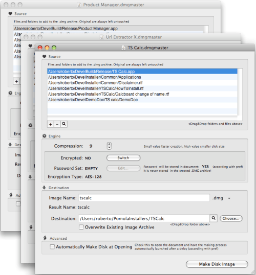 The unique document based approach used by DMG Master lets the user save a lot of time in the use of the software if compared with the classic utility approach. Using DMG Master the user has to do that just one time and save all the settings in a document. After that, the user opens the document from disk and press the Make Disk Image button. The disk image is created on the fly with the updated content. From this release, DMG Master can use a 'Make Disk at Opening' option to create backup archive without user interaction, using scripts or launcher utilities (Cronette or others), simply opening DMG master documents.