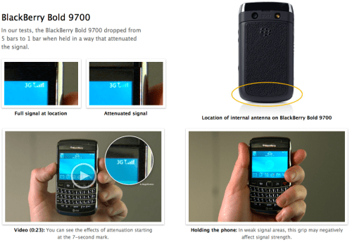 BlackBerry Bold 9700 In our tests, the BlackBerry Bold 9700 dropped from 5 bars to 1 bar when held in a way that attenuated the signal.