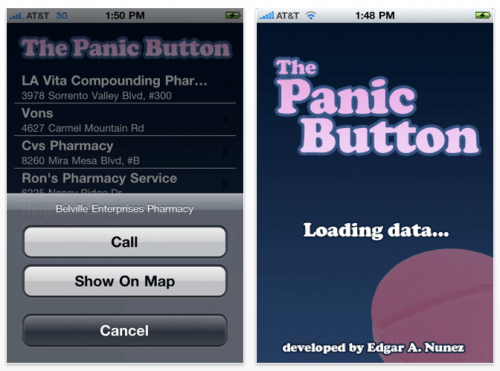 Edgar A. Nunez has introduced The Panic Button Pharmacy Finder 1.0 for iOS, his app that locates local pharmacies that may sell emergency contraception products. If unsure whether proper protection had been used during sex, the user can simply hit The Panic Button Pharmacy Finder for a scrollable listing of the 20 nearest pharmacies, including addresses and telephone numbers. Purchasing the "morning after pill" is simplified with integrated telephone dialing and map services.
