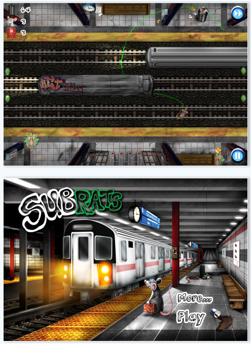 Keep an eye on the garbage and money trains to see what they might drop. Prove that you can survive living on the edge under trains made from tons of steel, or use your reflexes to pull the emergency brake to stop the action. And be sure to enjoy the different subway tunes, strange sounds, and the comments of daily commuters, tourists, and "true" subway riders. Subrats is a lightning fast, funny, and highly addictive real-time action game for all ages from White Shoe Media. Don't blame us if you miss your stop!