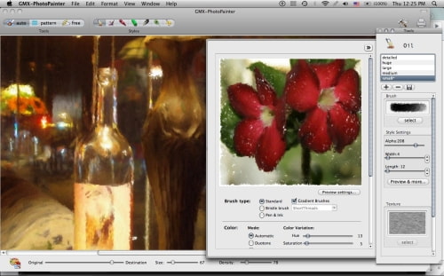 Custom Styles: GMX-PhotoPainter for Mac OS X lets the user create its own style from the ground up, with a deep level of customization, including the shape of the brush, texture, color sampling technique, width, length, and many more features. There are in fact more than 40 different parameters, organized from the most common parameters like width, length, transparency, to more sophisticated parameters like color variation, pen & ink behavior and others.