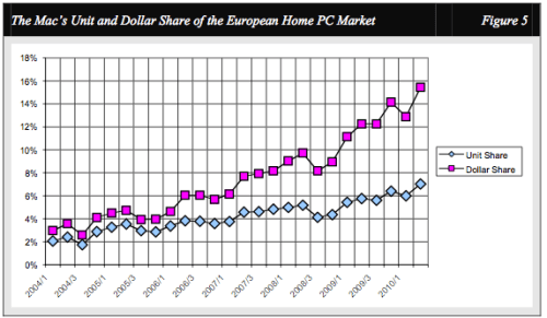 While Apple's fastest growth was in the largest enterprises, Wolf found an "intriguing phenomenon" in the European home market where Apple's unit share more than doubled between Q1 and Q2 (from 3.4% to 7%) and its dollar share more than tripled (from 4.6% to 15.4%).
