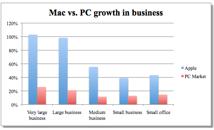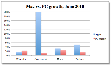 Analyst Charlie Wolf found that: ● At 35%, Mac shipment growth in June easily exceeded the market's growth rate of 20.9%. ● Mac shipments grew 31.4% in the home market, topping the market's growth rate of 25.2%. ● At 49.8%, the Mac's growth in business was three times higher than the market's 15.7%. ● Mac shipments in government grew 200%, sixteen times faster than the market's 12.1%.