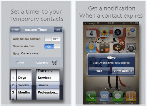 HiBye 1.4 features include: * Apply a timer amount to your temporary contacts * Edit the timer and categories at any time * Get an alert when a contact is about to expire, to reset the timer or delete the contact * See all your timed out contacts in one list; no more searching for individual contacts throughout your regular contact list * Archive unused contacts, and retrieve them again later with one click * Preset a default timer that will apply to each new individual contact that is added * Create a note that will assist you in remembering that contact later on * All contacts are saved in the iPhone address book, and are all synchronized and backed up into all other devices * Add up to 8 categories to help organize your contacts * Categorize all your contacts by group, location or category * Add contacts from other devices such as computer, mobile me, Google contacts, or any other contact source that is synched with your iPhone * Use "HiBye Dummy" to add phone numbers from your incoming/outgoing call lists or email
