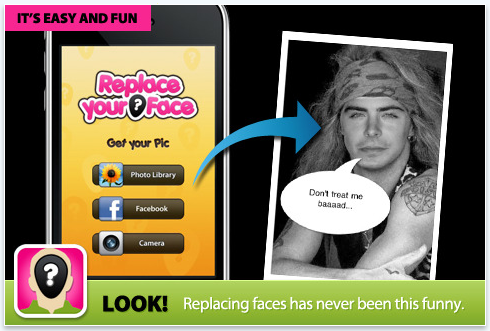 Replace Your Face At-a-Glance: * Choose from photos in the Photo Library, Facebook, or from pictures taken by the iPhone's camera * Edit pictures from 150 different possibilities: from different celebrities, decades, or genres * Pictures can be shared on Facebook or through email, or they can be saved onto the device * Photo effects include text bubbles and contrast adjustments