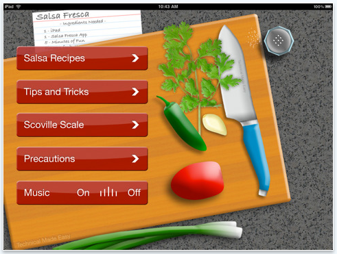 Technical Made Easy has announced the release and immediate availability of Salsa Fresca HD 1.0 for Apple's new iPad device. Salsa Fresca provides detailed recipes with high-resolution images of each type of salsa. It is the perfect companion for salsa lovers everywhere ranging from traditional to exotic flavors. With a fun interface and catchy music you will be heating things up in the kitchen in no time. Fresh red and green salsas, Pico de Gallo and more are right at your fingertips.
