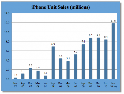 The Q4 iPhone estimates of the analysts we've polled vary wildly, from a low of 10 million units from Morgan Keegan's Tavis McCourt to a high of 13.3 million from Rodman & Renshaw's Ashok Kumar. At the low end, that represents a 35.7% increase from Q4 2009. At the high end, it's more like 80% year over year.