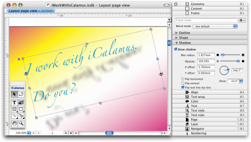 iCalamus can import all image and text formats which are supported by Mac OS X. Easily grab text content from large PDF documents for further text processing. Images from digital cameras, scanners or iPhoto libraries can be imported, as well as complete web pages. Print output supports all printers, and iCalamus can optionally output documents in various PDF formats (e.g. PDF-X, encrypted PDF, PDF Fax).