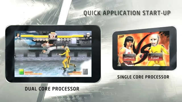 At the one minute mark there's a segment that shows Spec Fighter, a martial arts game where the Optimus Pad fights the "A pad" whose virtual likeness is clearly meant to represent Steve Jobs. Without much ado the Optimus Pad delivers a foot to the face of the "A pad".