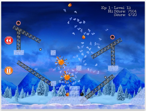 The Level 2 tutorial shows a spherical bomb with lit fuse, and demonstrates that the bomb pickup is unlocked by dragging and dropping it to a place onscreen where its red selection glow turns green, "The bomb will explode when hit." In this position four green arrows surround the bomb, indicating that it can be moved again, or the player can select another pickup. Playing Level 2 displays the kumquat atop a tower of ice blocks. The metal ball is set to fall down an inclined plane of ice and into the tower, while the bomb, in the top left corner, awaits unlocking. Touching play proves that the metal ball dislodges but does not collapse the tower.