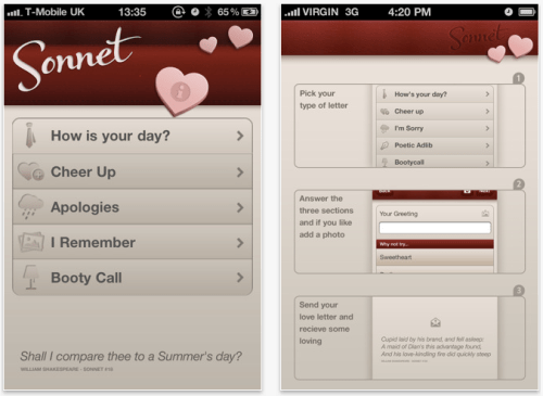 Motivapps has announced the release of Sonnet 1.2, their personal productivity app for iOS devices. One in a series of a few apps that teach and inspire, Sonnet inspires iPhone users to write love letters. Created during Cambridge Startup Weekend, it conquered the hearts of the audience and won the wildcard prize. Judges called it a delightful little app.