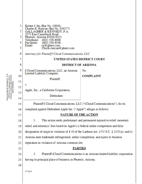 In a suit filed yesterday in the US District Court in Arizona, a company named iCloud Communications has claimed trademark infringements against Apple over the iCloud name.