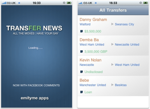 Emityme Apps has launched Transfer News App for iPhone, their free sports information app that gives you all the latest football players transfer news. The application reveals details of football transfers across the major european leagues including the Barclays Premier League, Italian Serie A, Spanish Primera Division and the German Bundesliga. The app reveals the transfer fees, loans, teams buying and teams selling players.