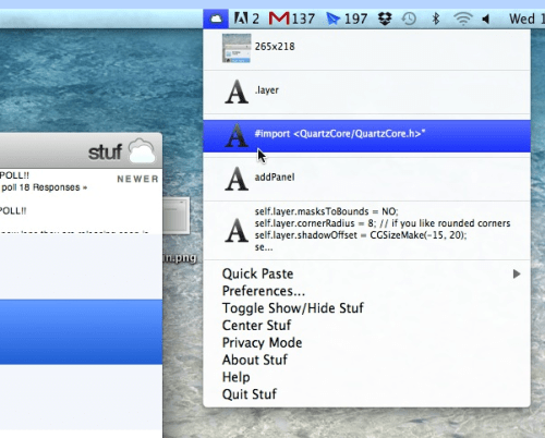 Stuf 2 allows users to copy data such as text or an image on a Mac, and paste it on a PC. Stuf 2 frees the clippings from the local network, and now users need only have access to Dropbox to share clippings. Workgroups can also host their clippings on existing network drives for more performance.