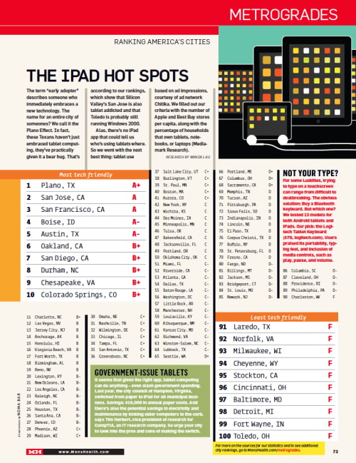 A new survey that will appear in the September issue of Men's Health ranks the Top 100 American cities that have embraced the iPad.