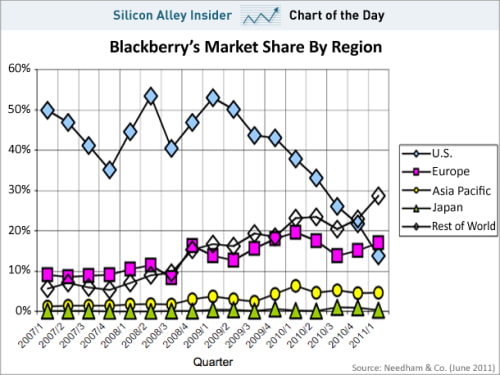SAI Highlights: ● EPS was $0.80 versus expectations of $0.88 ● Revenue was $4.2 billion versus estimates of $4.5 billion ● It shipped 10.6 million BlackBerrys versus expectations of 11.9 million units ● RIM shipped 200,000 PlayBooks versus expectations of 400,000-600,000 ● RIM's cash was wiped out: It went to $1.4 billion at the end of the quarter compared from $2.9 billion in the quarter before. It spent $780 million on the Nortel patents, and had $285 million in capital expenditures. ● Q3 revenue outlook is $5.3-$5.6 billion which is above the street's expectation (via RBC) of $5.3 billion.