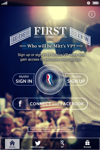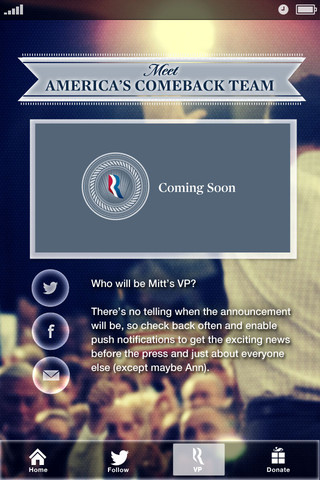 Just download the app and when Mitt decides on his running mate, you'll get an exclusive notification from the campaign letting you in on the exciting news before the press and just about everyone else (except maybe Ann).