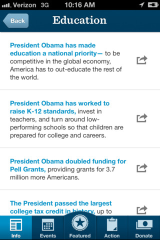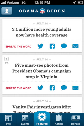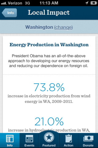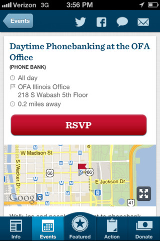 Features: Get the facts: Find out how President Obama's policies are helping people in your community, and get the most up-to-date info about the President's accomplishments. Find events: Track what's happening near you, RSVP and invite friends, and get there on time with full map integration. Share breaking news: Stay in the loop with important updates, and use Facebook, Twitter, email and text messaging to spread the word to your friends. Take action: Sign up to volunteer, join a local team, and talk to your neighbors about why you support President Obama. Get out the vote: Access voting and registration rules for your state, help register friends, and make sure supporters get to the polls on Election Day.