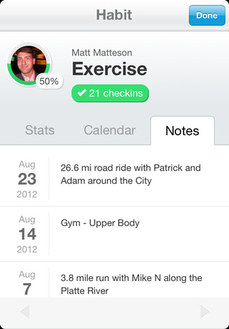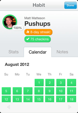 Features: ☆ Pursue an unlimited number of habits for free ☆ Easily checkin to your habits with just one tap per day ☆ View weekly and monthly reports about your progress ☆ Include some notes to form a journal around your habits ☆ Support others who are pursuing the same habits by giving them props ☆ Connect your Twitter account to follow your friends' habits ☆ Check out the most popular habits and join any that interest you