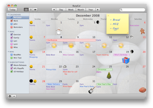 In addition to calendar sharing and synchronization, BusyCal provides the ability to display graphics, sticky notes, and live weather feeds; create ToDos, including recurring ToDos, that display in the calendar view and auto-forward until completed; view events in a customizable List View; and apply custom fonts, styles and colors to events. These unique features are available in BusyCal, while maintaining compatibility with other apps and services including BusySync, Google Calendar, Sync Services, iCal, MobileMe and the iPhone.