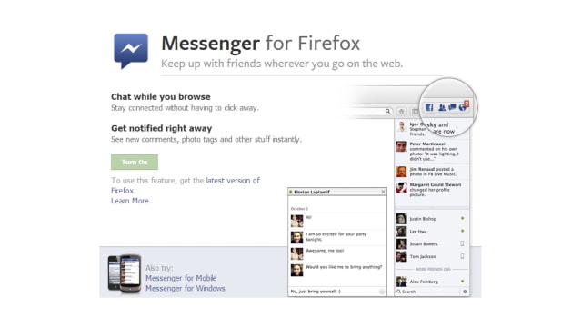 -- To get started, just upgrade to the latest Firefox and then visit the Facebook Messenger for Firefox page and click “Turn On.” You can watch this video to see how it works.